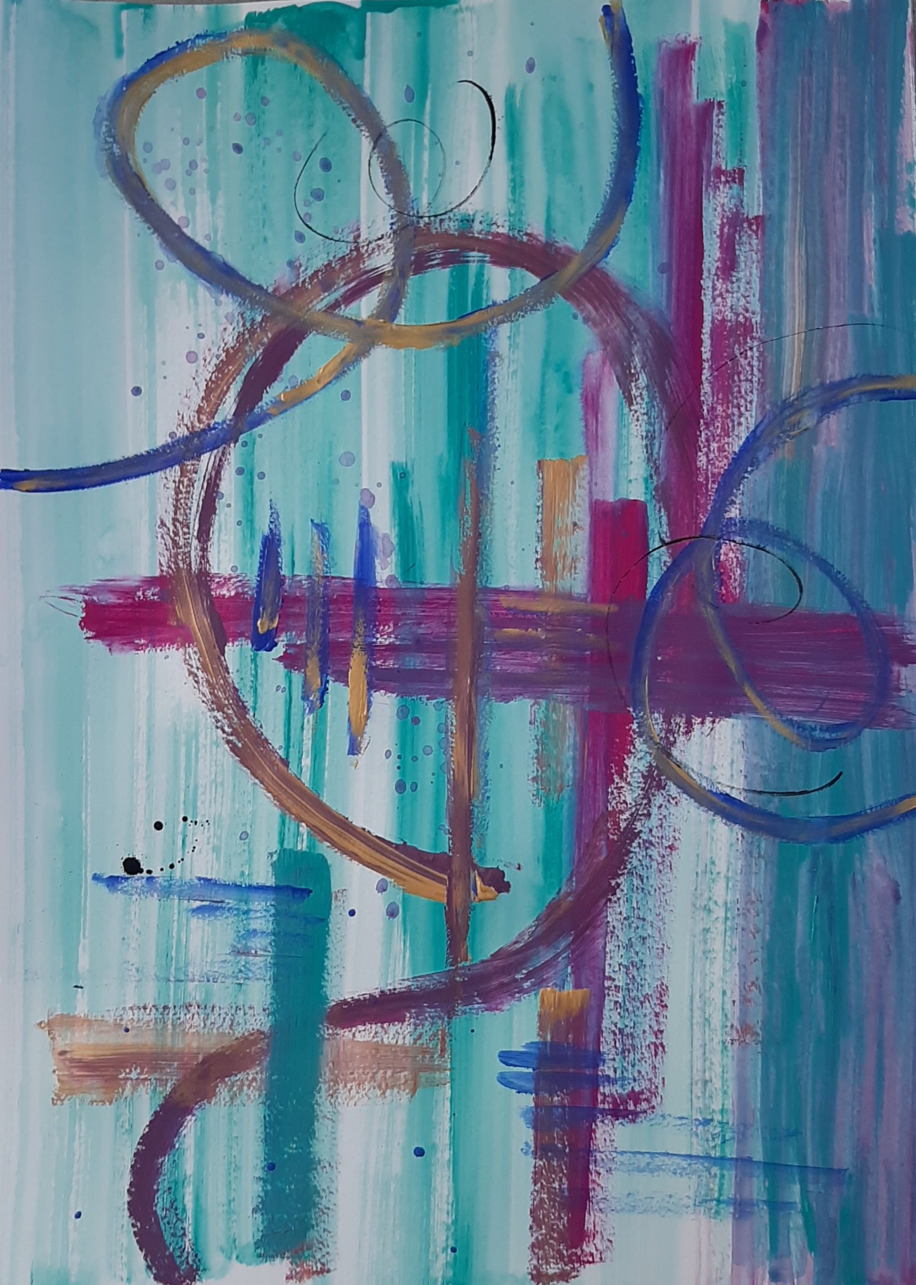 Obra única realizada en papel con pintura acrílica. Necesita enmarcacion para poder colgarla a la pared. Los colores que predominan son turquesa, fucsia, azul y dorado.