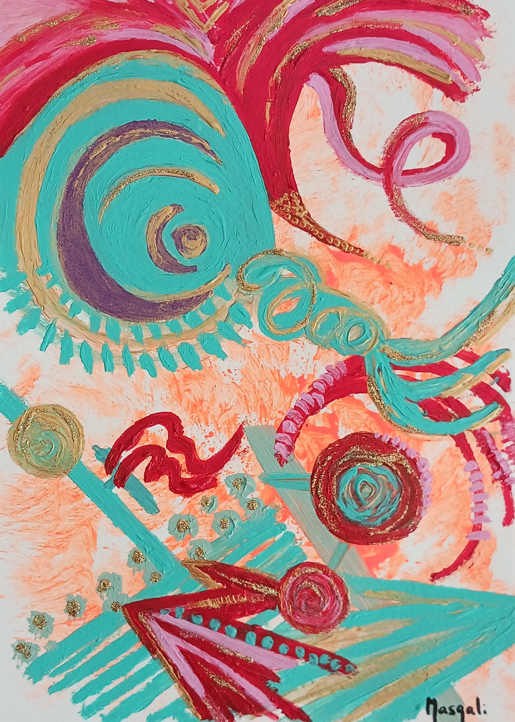 Materiales: Pintura acrílica y purpurina dorada.